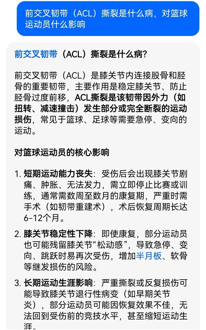 为此,我咨询了国内豆包:这个伤病手术后至少得休息6-12个月。并且,对篮球运动员的后期发力,变相都有巨大影响。